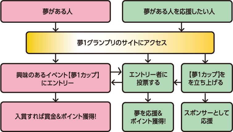 夢1グランプリは、あらゆるジャンルのあらゆるテーマのNo.1を決めるwebイベントサイトです。誰でもエントリー、投票することができ、結果によって賞金が支払われます。夢1グランプリのステークスホルダーは参加して頂く皆さんであり、夢1グランプリの財産は皆さんの夢であると考えています。